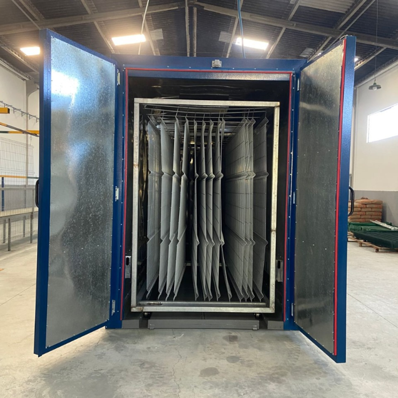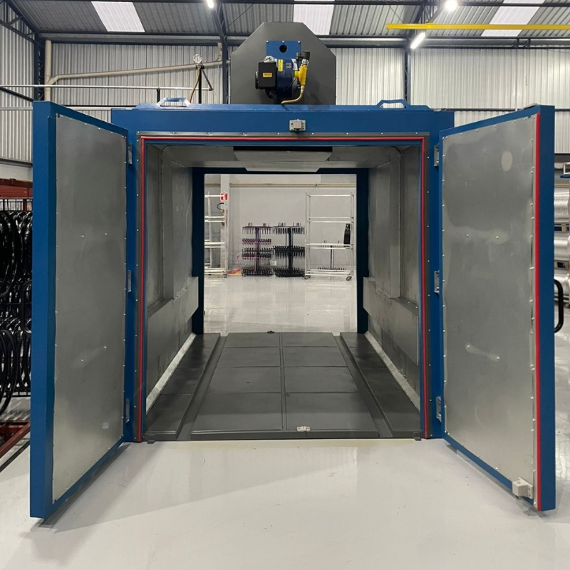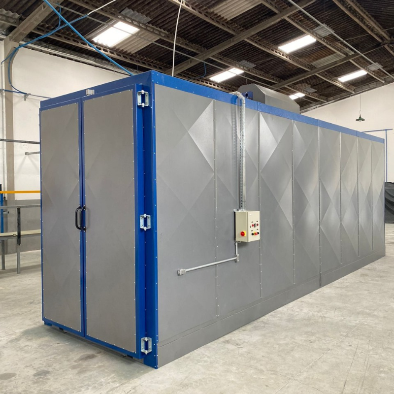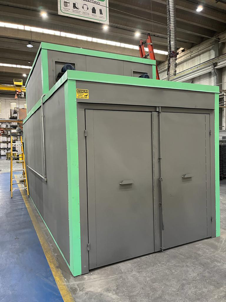 Estufas para pinturaNossas estufas de pintura para cura estacionária com portas de entrada e saída são projetadas para realizar o processo de cura em lotes de peças ou componentes, permitindo a movimentação controlada dos materiais em um ambiente fechado. Ideais para operações que necessitam de controle rigoroso de temperatura e fluxo de ar, essas estufas são amplamente utilizadas em indústrias de pequeno a médio porte ou em processos específicos dentro de grandes plantas industriais.