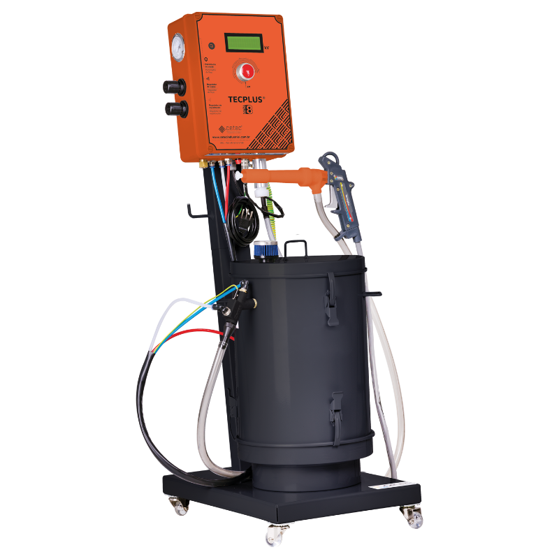 Linha Manual, Pintura EletrostáticaO Tecplus 8 é um aplicador manual para pintura eletrostática a pó, projetado com base nas principais necessidades dos operadores. Visando a facilidade de uso ele é um equipamento mono comando, ou seja, possui apenas um botão de controle, liga/desliga e regulagem da tensão, eletrônica com microprocessador 100% fabricada pela Cetec.